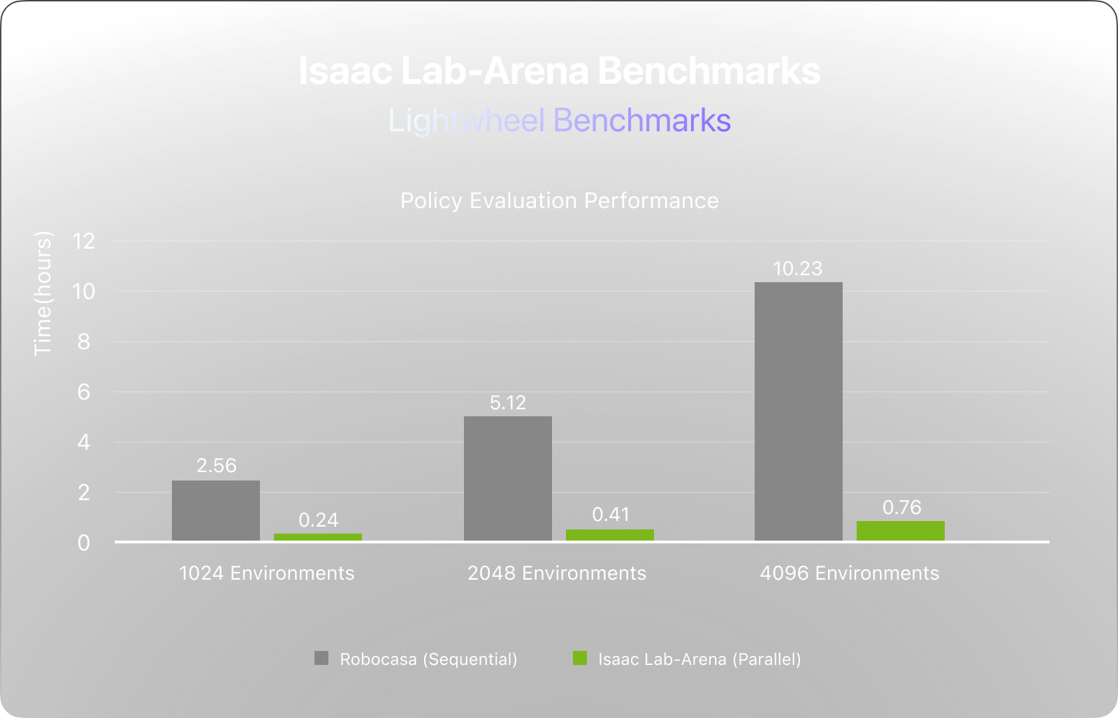 NVIDIA Isaac Lab - Arenais an open-source framework for large-scale policy evaluation, featuring GPU-accelerated parallel evaluation that could transform policy evaluation workflows. Today, we are sharing comprehensive benchmark results that validate those claims: Isaac Lab-Arena achieves up to 13.5× faster policy evaluation compared to sequential execution, reducing evaluation time from over 10 hours to under 1 hour for complex manipulation tasks.