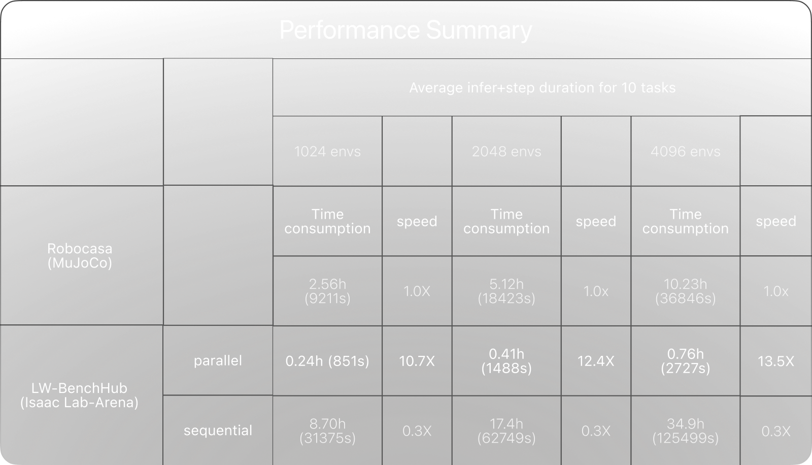 We conducted comprehensive performance benchmarks comparing Lightwheel-RoboCasa-Tasks built on Isaac Lab - Arena against the widely-used RoboCasa Benchmark built on Robosuite and MuJoCo simulation stack. The test was designed to isolate performance differences primarily in parallel simulation and runtime infrastructure, not the evaluation method or policy.