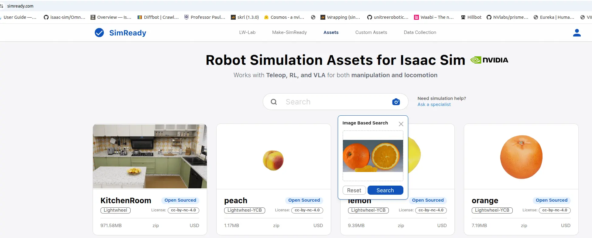 Natural Language + Image Based Search: At Lightwheel, we have implemented NVIDIA USD Search API as the core discovery engine across our platforms, tailoring its multi-modal capabilities to specific user needs. On SimReady.com, USD Search is currently deployed across approximately 2,000 of our highest-quality, most rigorously curated assets specifically designed for robotic manipulation and locomotion. This premium collection includes the foundational objects from the YCB Benchmark, which we have standardized and now offer as Lightwheel-YCB.