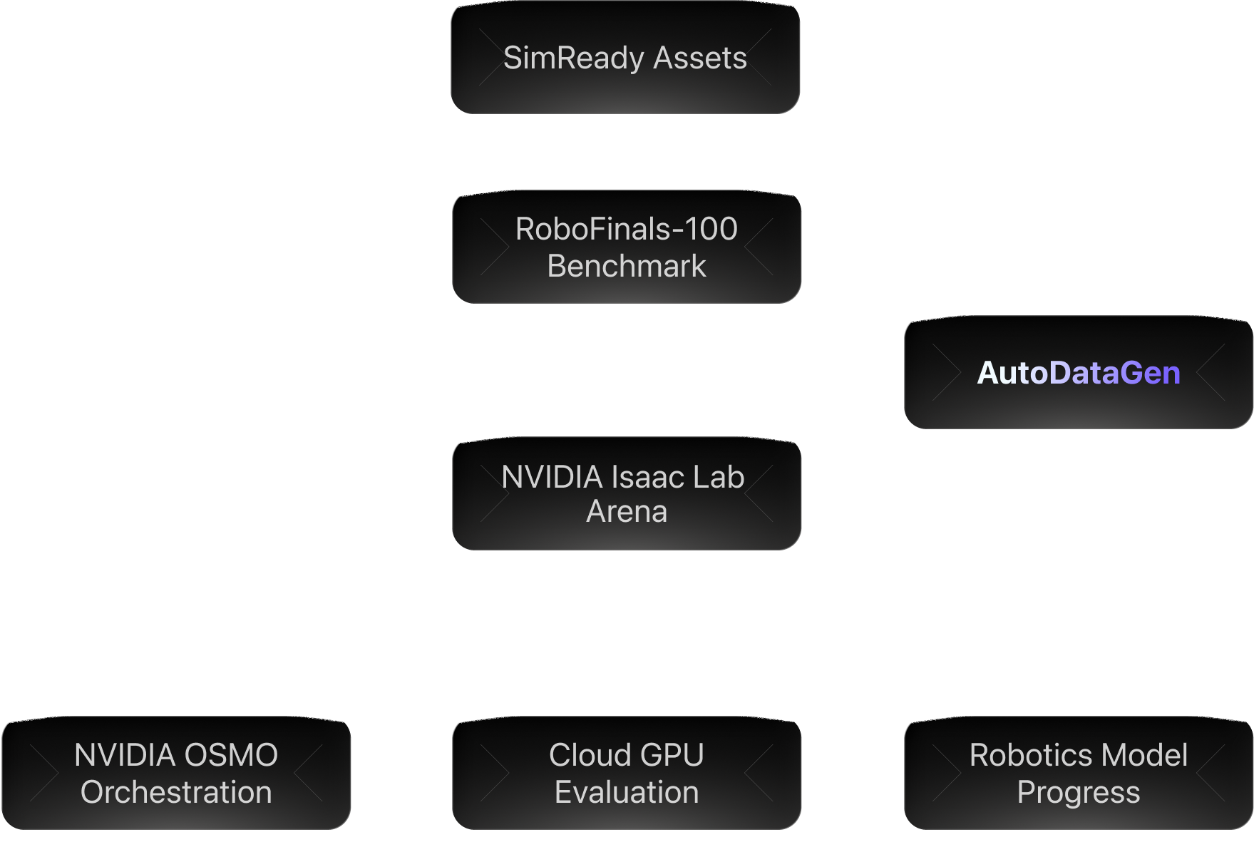 Together, AutoDataGen provides the automated data generation layer that supports large-scale robotics benchmarking workflows.